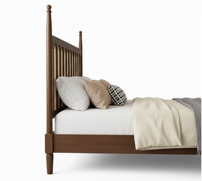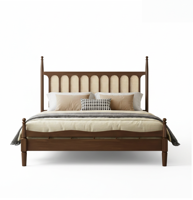 The Classic Spindle Bed is a beautiful tribute to mid-century modern design, focusing on symmetry and high-quality natural materials. This bed features a distinctive headboard characterized by a series of vertical wooden arches that create a “window-pane” effect, with each arch inset with premium natural cane (rattan) mesh. This design provides a light, breathable aesthetic that adds a layer of organic texture to your sleeping space.