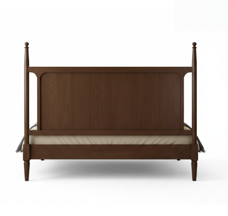 The frame is expertly crafted from solid wood, showcasing a rich walnut finish and beautifully turned posters at all four corners. The posters are topped with elegant finials, while the legs are subtly tapered to provide a stable yet airy profile. The footboard features a gentle wave-like curve, perfectly balancing the structured lines of the headboard. This bed is an ideal choice for a clean, sophisticated bedroom that values both vintage charm and modern durability.