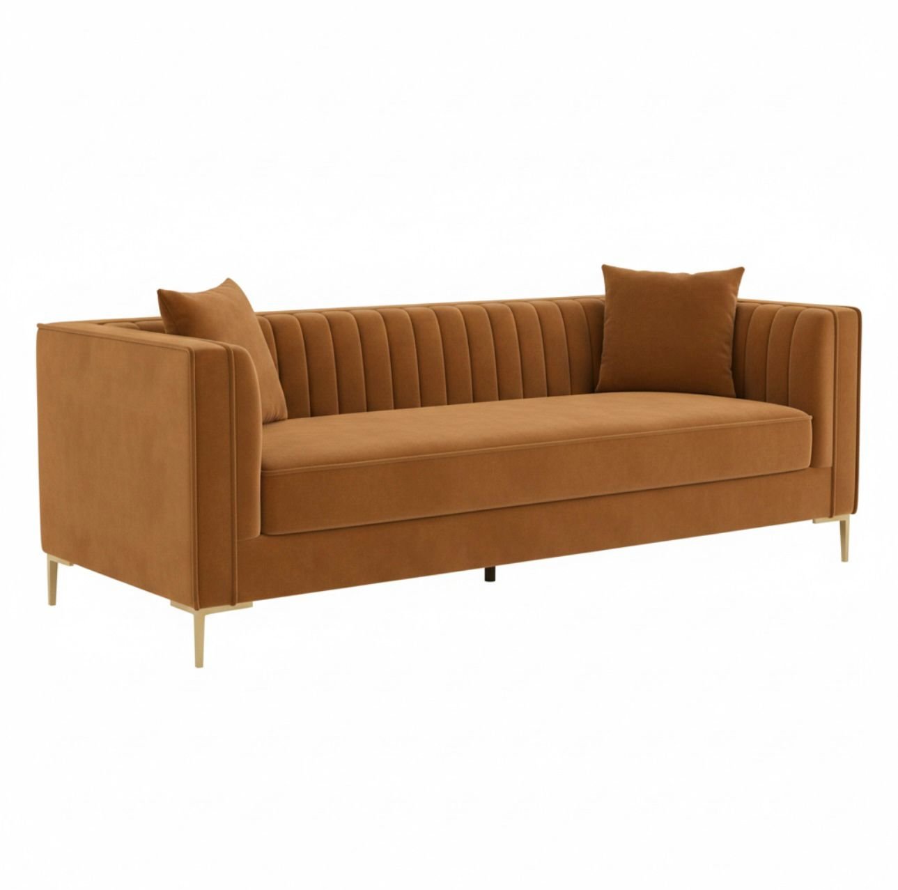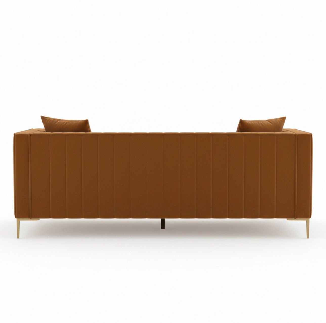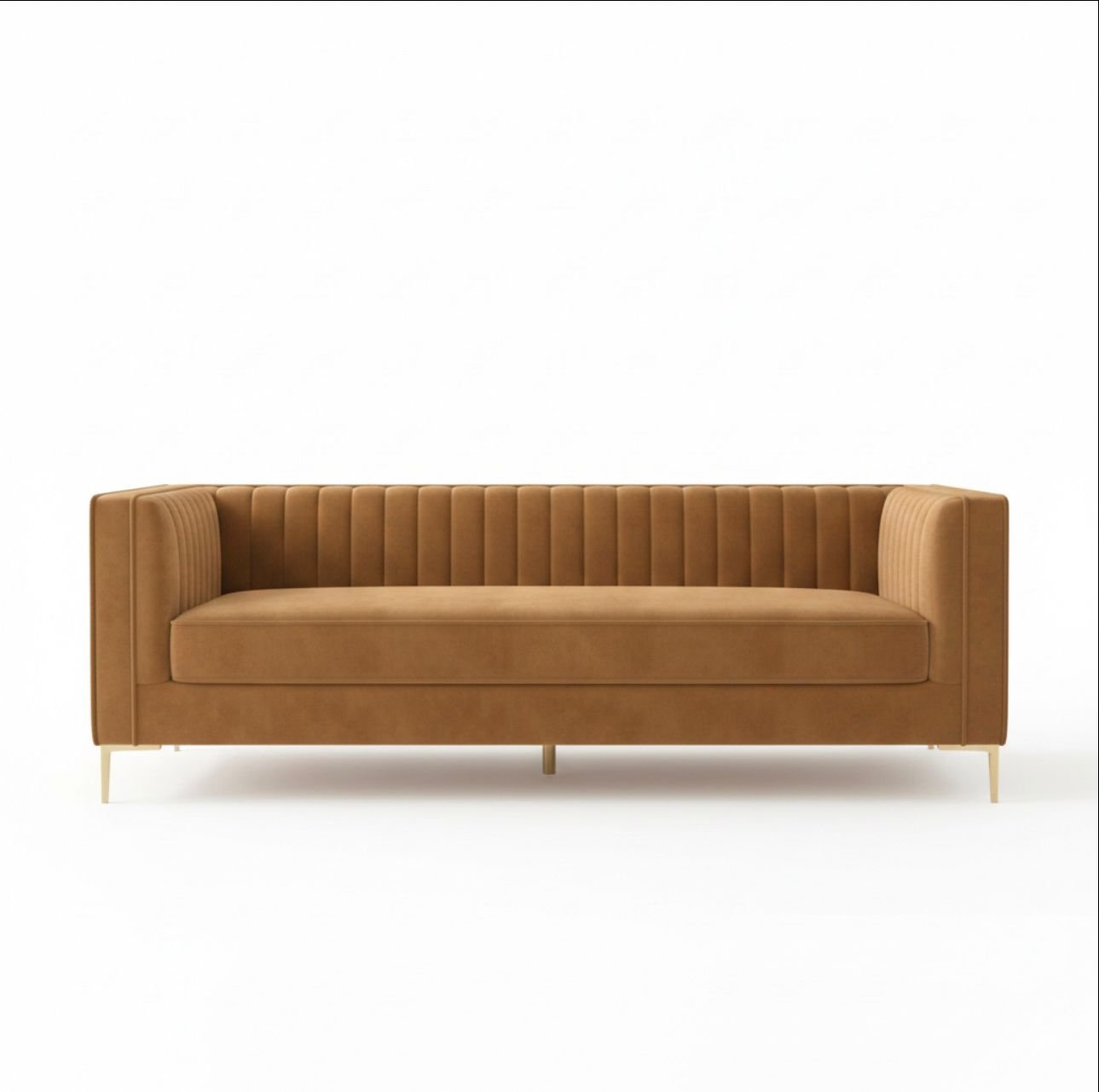 The 3 Seater Velvet Sofa is a stunning centerpiece that brings a touch of “Glam” and modern architectural depth to your home. This piece features an elegant, high-profile backrest with intricate vertical channel tufting (fluting), providing a rhythmic and sophisticated look. Wrapped in premium, soft-touch velvet upholstery in a warm terracotta-tan tone, the sofa offers a plush, inviting texture that is both durable and luxurious.