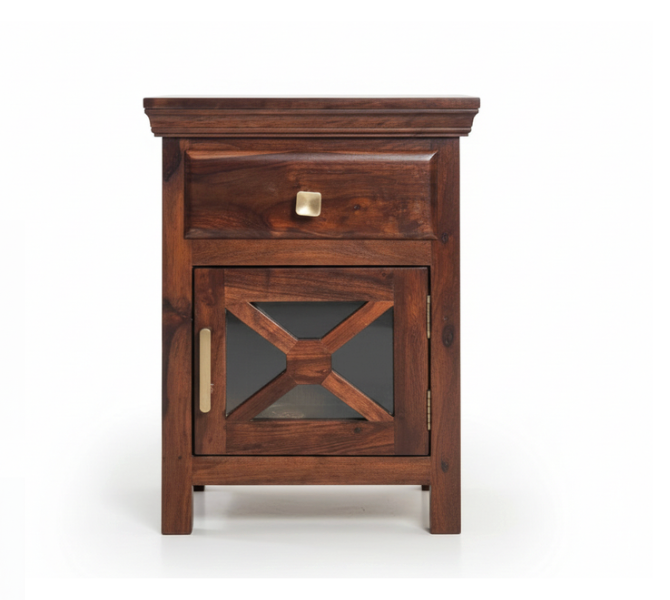 The Cross Panel Bedside Table is a sturdy and character-filled piece designed for those who appreciate traditional woodworking with a modern twist. This unit features a versatile storage layout, including a smooth top drawer and a lower cabinet with a signature “X” cross-panel glass door. The glass insert adds a touch of transparency, making it easy to see stored items while protecting them from dust.