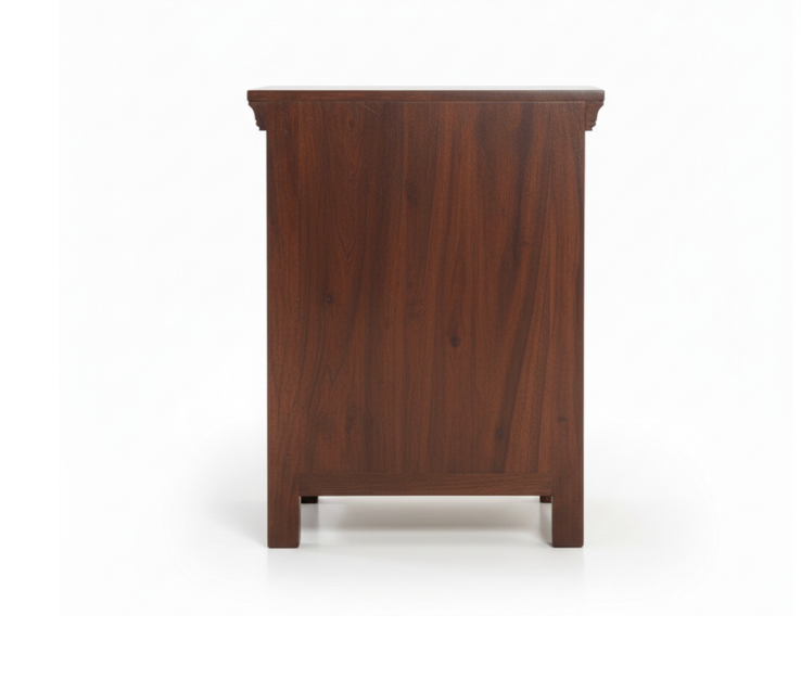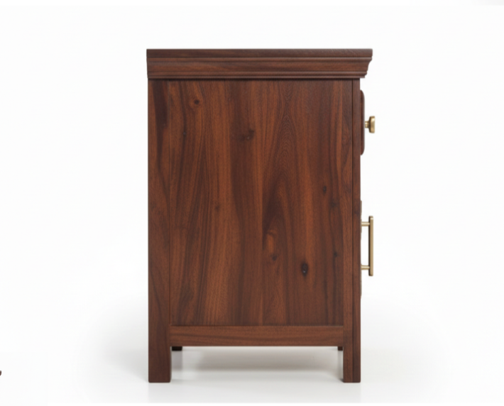Handcrafted from premium solid Sheesham wood, the table showcases a deep walnut finish that brings out the rich, swirling grain patterns and natural knots of the timber. The design is accented with high-quality brass-finished iron hardware, including a square knob for the drawer and a sleek vertical handle for the cabinet. With its thick pedestal top and solid block legs, this bedside table offers heavy-duty durability and a timeless look for any master bedroom.