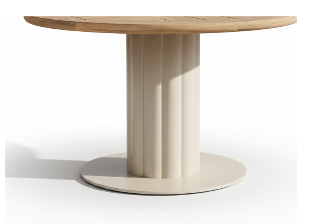Fluted Pillar Dining Table is a sculptural masterpiece designed to be the focal point of any modern dining room. This table features a stunning circular top with a unique multi-directional wood grain pattern that adds a touch of geometric art to its organic surface. The standout feature is the thick cylindrical pedestal base, meticulously detailed with architectural fluting in a sophisticated ivory-matte finish.