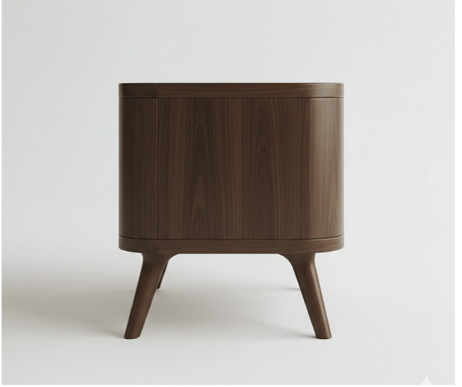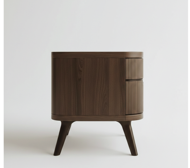 Fluted Wooden Bedside Table is a sophisticated blend of texture and soft organic curves. This piece features a unique pill-shaped body meticulously detailed with a vertical fluted (ribbed) pattern that wraps around the entire unit. It includes two wide, smooth-gliding drawers that offer a seamless appearance, with an integrated carved handle on the bottom drawer for a hardware-free, minimalist look.