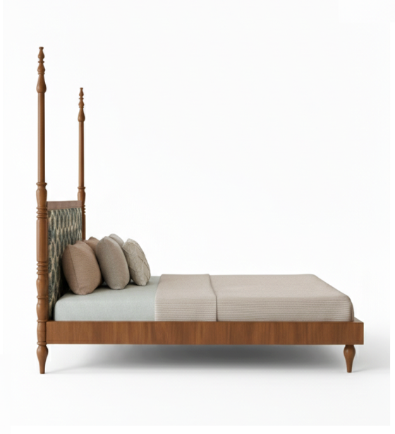 The Four-Poster Patterned Bed is a sophisticated blend of traditional architecture and modern textile design, perfect for a “clean” and artistic bedroom look. This bed features two tall, hand-turned posters at the head, crafted with intricate ring detailing and slim tapered finials. The centerpiece is the rectangular wooden headboard, which showcases a stunning inset panel of patterned fabric with a classic floral/mandala motif, adding a unique touch of heritage and color.