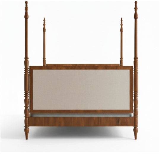 The bed is built with a solid wood frame and sits on beautiful turned “bun” feet that ensure maximum stability while maintaining an elegant profile. Finished in a warm natural polish, the wood’s organic grain complements the detailed fabric insert. This design offers the grandeur of a poster bed with a contemporary, low-profile footboard, making it an ideal choice for rooms that value both traditional style and open space.