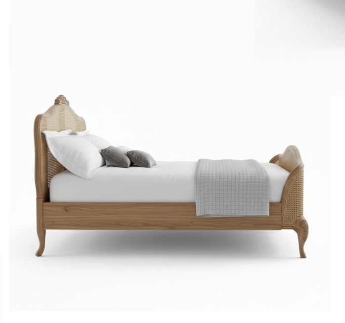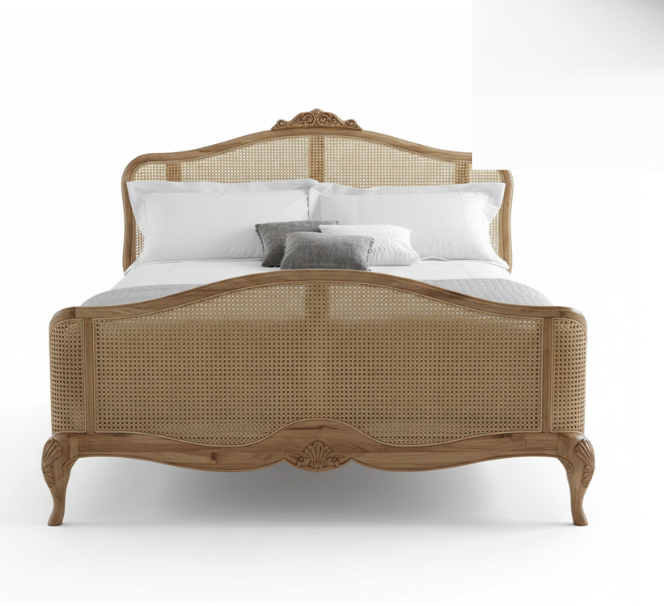 French Cane Bed is an exquisite piece of vintage-inspired furniture that brings a “clean” and airy elegance to the bedroom. This bed features a classic arched headboard and matching footboard, both beautifully inset with authentic natural cane (rattan) webbing. The frame is adorned with delicate hand-carved floral accents and a scalloped silhouette, characteristic of refined French provincial design.
