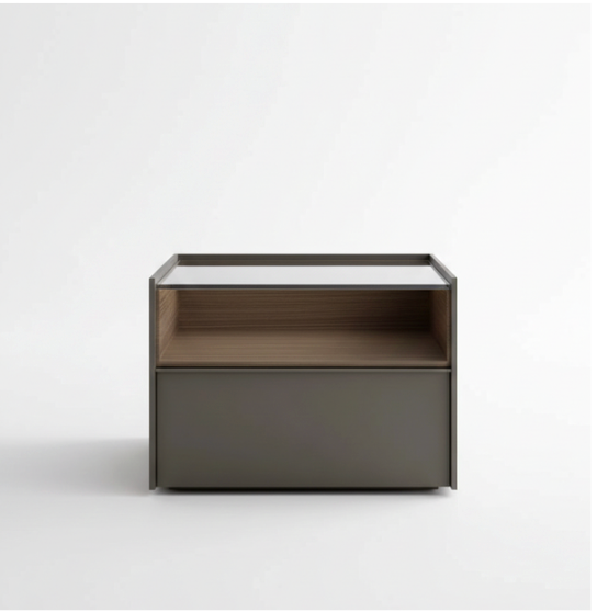 The Glass Top Bedside Table is a sophisticated piece of modern furniture that brings a sleek, airy aesthetic to any contemporary bedroom. This unique design features a premium tempered glass top that reveals a spacious open shelf lined with beautiful natural wood grain. Below the open display area sits a large, seamless drawer that provides deep storage for your personal items, maintaining a clutter-free look.