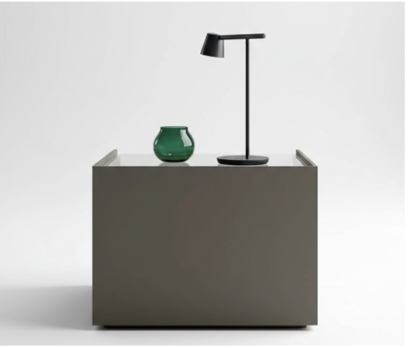 Handcrafted with a sturdy frame and internal structures of solid Sheesham wood, the table is finished in a smooth, matte charcoal grey that contrasts elegantly with the warm wood interior. The handle-less drawer design uses a clean push-to-open or integrated lip mechanism to keep the silhouette sharp and architectural. Its low-profile, boxy frame makes it an ideal choice for luxury modern suites or minimalist urban lofts.