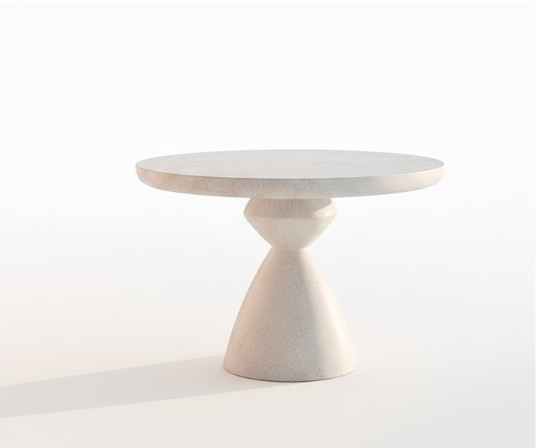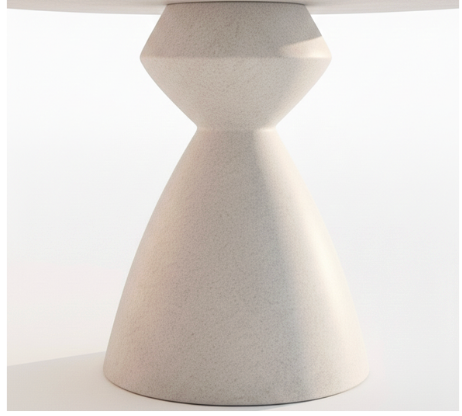 Hourglass Pedestal Table is a stunning example of minimalist geometry and bold architectural design. This circular dining table is defined by its signature sculptural base—a unique hourglass silhouette that tapers elegantly in the middle before flaring out into a stable, wide-set foundation. The seamless, monochromatic finish creates a clean and sophisticated look that makes the table appear like a singular piece of carved art.