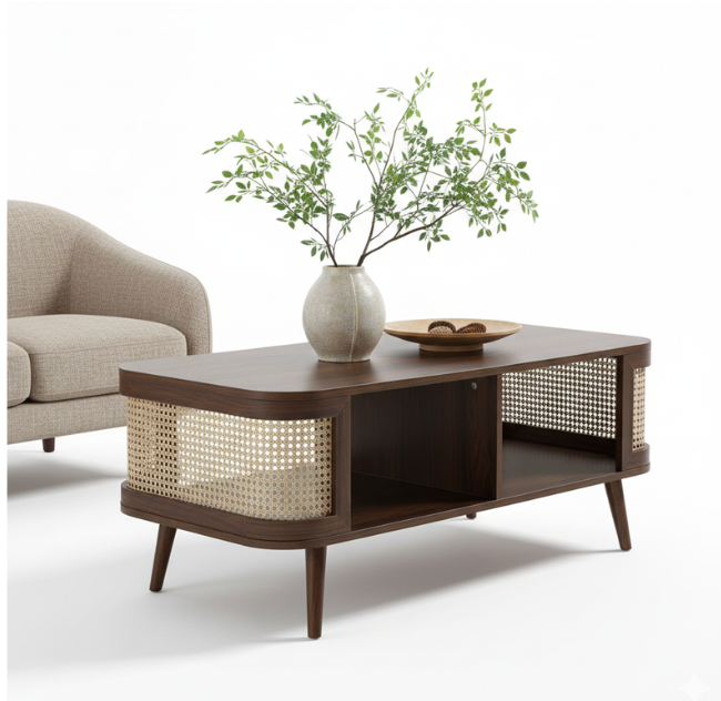 Storage: Integrated lower shelf with a semi-enclosed slatted design for stylish organization.