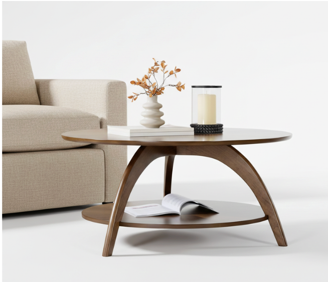 Crafted with a focus on clean joinery, this two-tier circular table features a generous top surface supported by sturdy, angled tapered legs. The vertical slatted detailing wraps partially around the base, creating a beautiful “peek-a-boo” effect for your stored items. Its minimalist yet intricate profile makes it a perfect fit for modern or mid-century inspired interiors.
