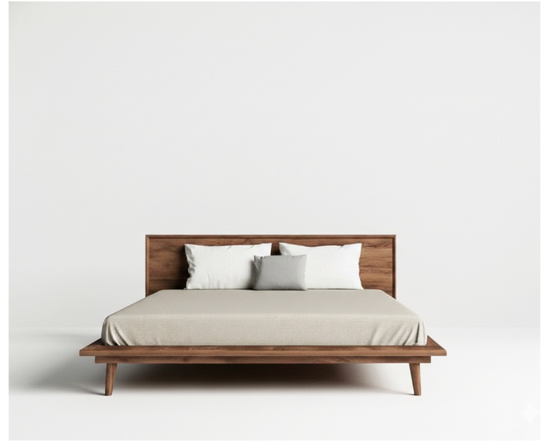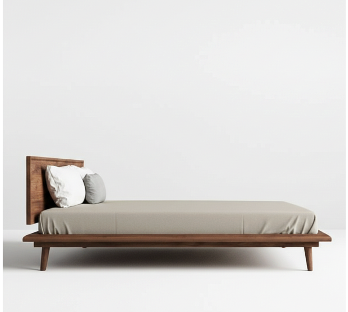 Built from premium solid wood, the frame is supported by elegant, tapered spindle legs that provide an airy feel and easy cleaning access underneath. The walnut-toned finish is smooth and sophisticated, highlighting the organic beauty of the wood while ensuring long-term durability. Its “less is more” aesthetic makes it the perfect centerpiece for a minimalist, Japandi, or modern urban bedroom.