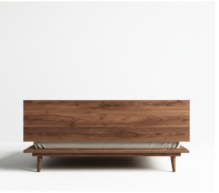 The Lowline Platform Bed is the definition of mid-century minimalist design, crafted for those who love a clean and open bedroom feel. This bed features a slim, low-profile platform that extends slightly beyond the mattress, giving it a sleek and grounded appearance. The rectangular headboard is made from a single solid panel of high-quality wood, showcasing a beautiful, uninterrupted natural grain that adds warmth to its sharp, modern lines.