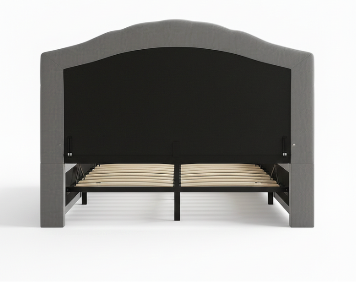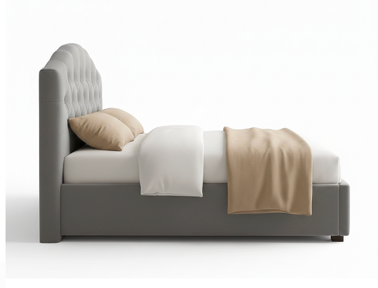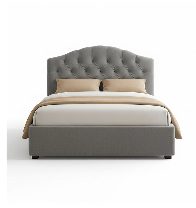 Royal Tufted Upholstered Bed is a masterpiece of classic elegance, designed to be the grand focal point of any master suite. This bed features a stunning scalloped headboard with deep diamond button-tufting (Chesterfield style), offering a plush and luxurious backrest. The fully upholstered frame in a sophisticated charcoal grey textured fabric provides a seamless and high-end look that exudes warmth and comfort.