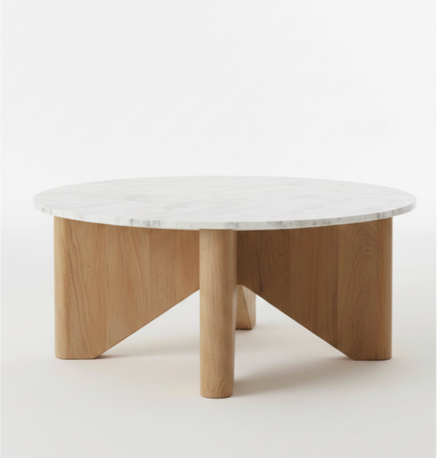 The Marble Round Coffee Table features a stunning natural stone top and sculptural oak legs. Its minimalist design and organic textures make it a high-end centerpiece for any modern home.