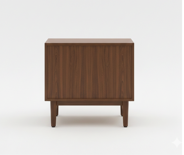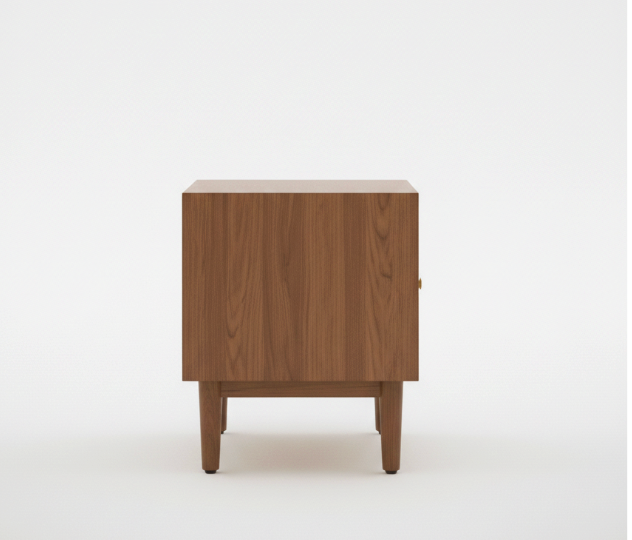 The table is topped with a thick, solid Sheesham wood surface with beautifully rounded “bullnose” edges, providing a sturdy and smooth area for your essentials. Supported by a subtle recessed wooden base, the piece has a grounded yet sleek appearance. Finished in a rich walnut polish that highlights the authentic wood grain and knots, this bedside table is an ideal choice for a clean, Japandi, or modern urban bedroom.