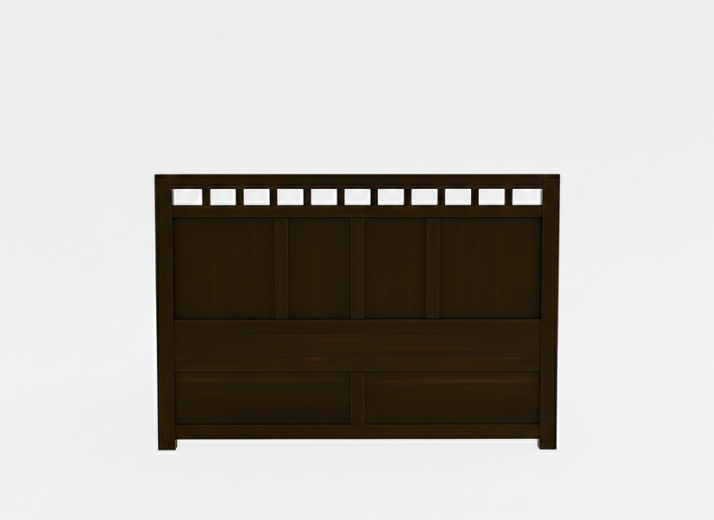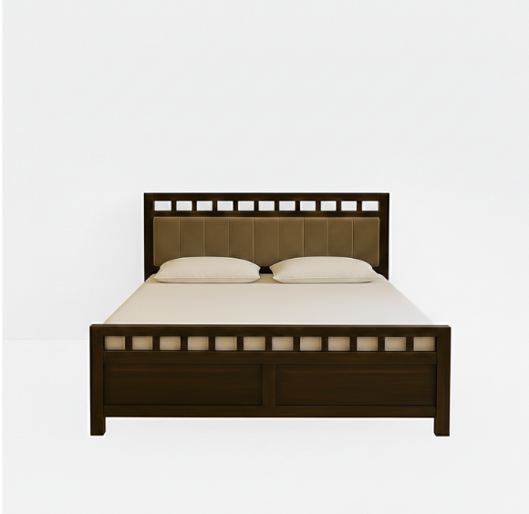 The Grid Panel Wooden Bed is a perfect blend of architectural strength and plush comfort. This bed features a striking geometric grid pattern carved into the top of both the headboard and the footboard, creating a sense of order and sophisticated design. The centerpiece of the headboard is a vertically tufted upholstered panel in a soft olive-brown fabric, providing a comfortable backrest for late-night reading.