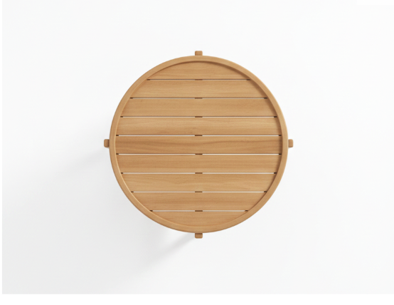 Design: Signature tray-style circular top with a sleek tripod-stretcher base.