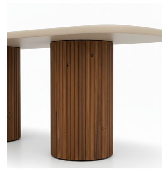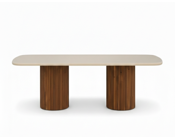 Terra Fluted Duo Table is a sculptural masterpiece designed for those who seek bold, contemporary luxury. This dining table is defined by its stunning “Capsule-shaped” top with seamless rounded edges, offering a smooth and inviting surface for grand family gatherings. The standout feature is the pair of massive cylindrical pedestal bases, meticulously detailed with architectural fluting that creates a beautiful rhythmic texture and a powerful visual foundation.