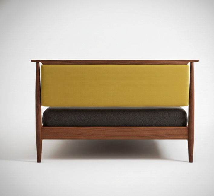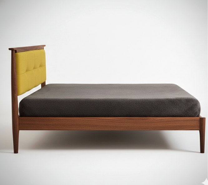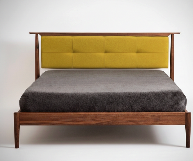 The Minimalist Wood Bed is a sophisticated example of mid-century modern design, focusing on “clean” lines and high-quality craftsmanship. This bed features a slim, elegant frame crafted from premium wood with a rich, natural grain finish. The standout feature is the suspended headboard, which features a cushioned panel upholstered in a vibrant mustard-yellow fabric with subtle tufting, providing a pop of color and comfortable support for lounging.