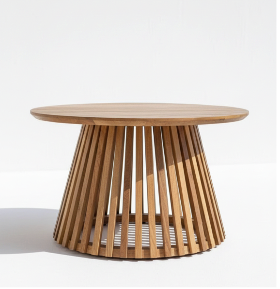 The Verena Coffee Table is a masterclass in geometric precision and architectural woodcraft. This piece features a perfectly circular tabletop supported by a dramatic, tapered pedestal base made of handcrafted vertical slats. The open-slat design creates a captivating play of light and shadow, giving the table a lightweight, airy feel while maintaining a bold, structural presence in your living room.