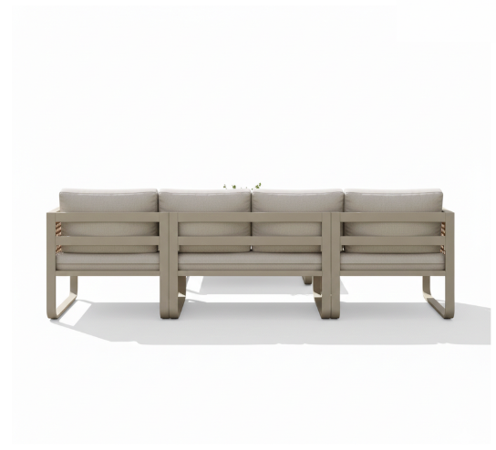 While the exterior showcases a minimalist metallic frame for maximum weather-resistance, the internal structural support is reinforced with a solid Sheesham wood base to ensure a noise-free, heavy-duty experience and superior lifetime stability. The set features extra-plush, high-density cushions upholstered in a premium stone-beige performance fabric, offering a soft yet firm seating experience. The ensemble is completed by a stunning marble-top coffee table and two matching architectural ottomans, making it an ideal choice for luxury rooftop lounges, grand sunrooms, or high-end poolside estates.
