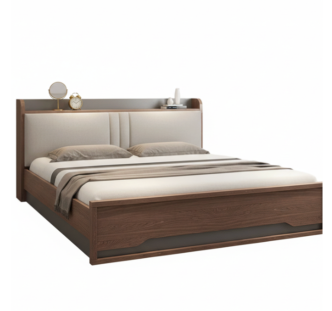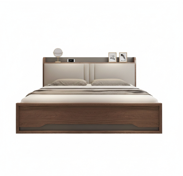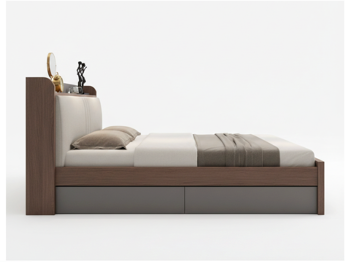 Vista Storage Bed is a masterclass in space-saving luxury and architectural design. This bed features a unique multifunctional headboard that includes a deep integrated display shelf at the top, perfect for keeping bedside essentials like books, clocks, or decor within arm’s reach. The headboard’s centerpiece is a premium off-white upholstered panel with elegant vertical channel stitching, providing a soft and comfortable backrest.