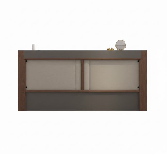 Design: Multifunctional headboard with integrated display shelf and upholstered backrest.