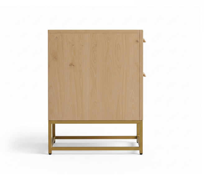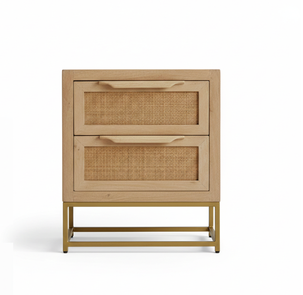 The Artisan Cane Bedside Table is a sophisticated blend of organic textures and industrial modern design. This piece features two deep drawers, each beautifully inset with premium natural cane mesh that offers a breathable, vintage-inspired look. A unique design element is the hand-carved integrated wooden handles that sit flush atop each drawer, maintaining a clean and sleek silhouette.